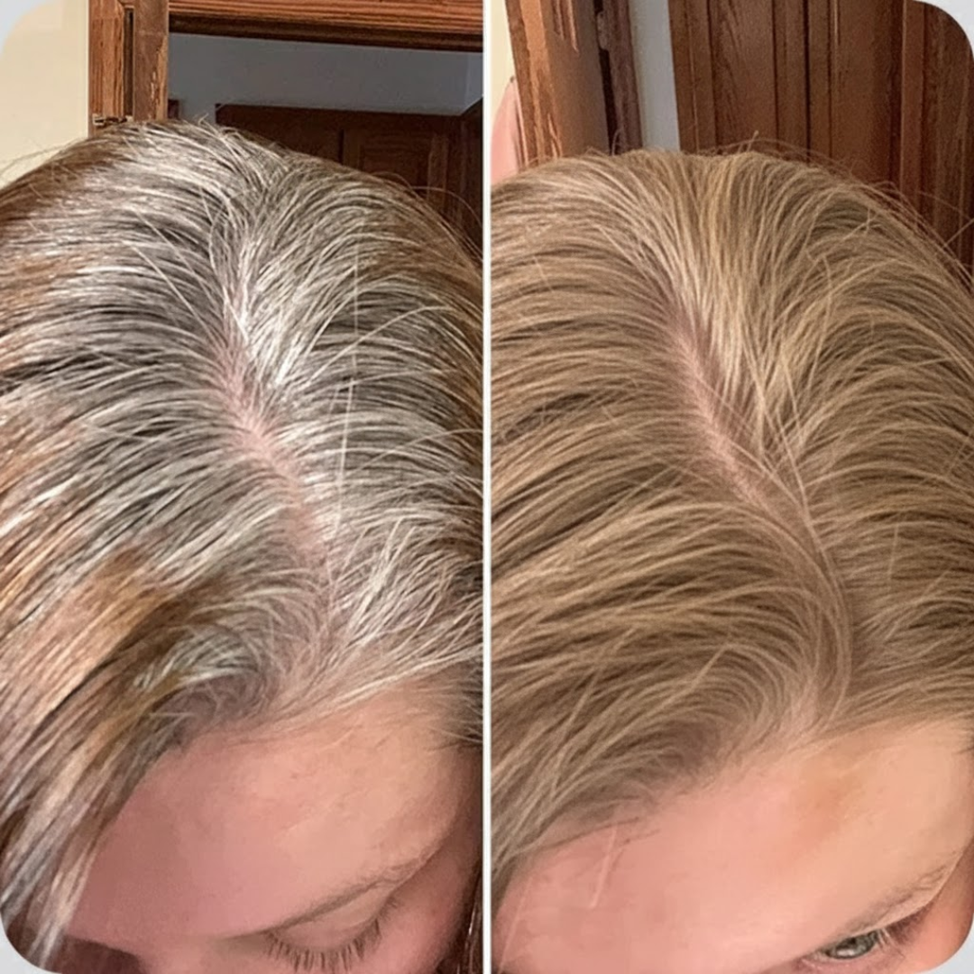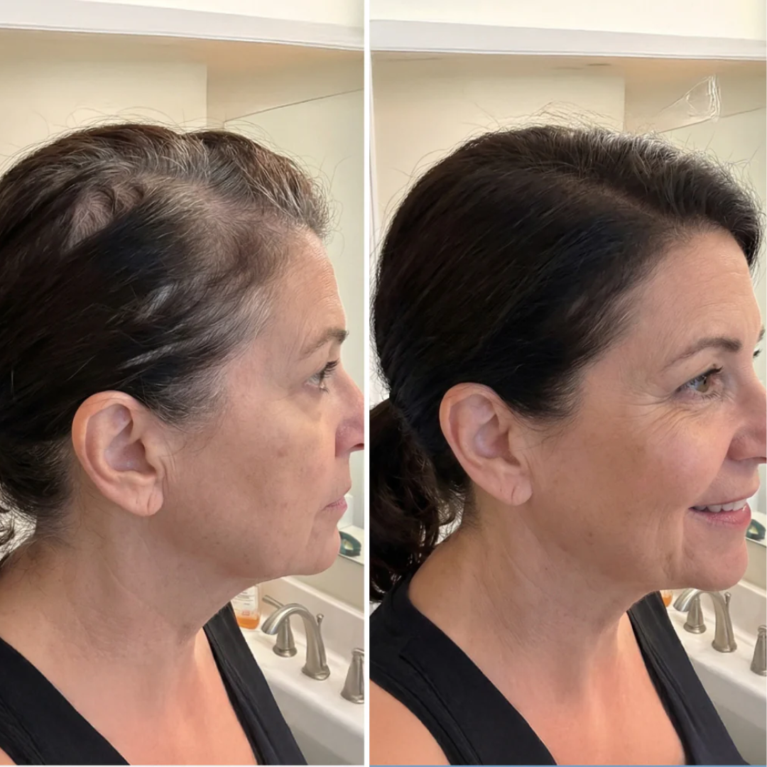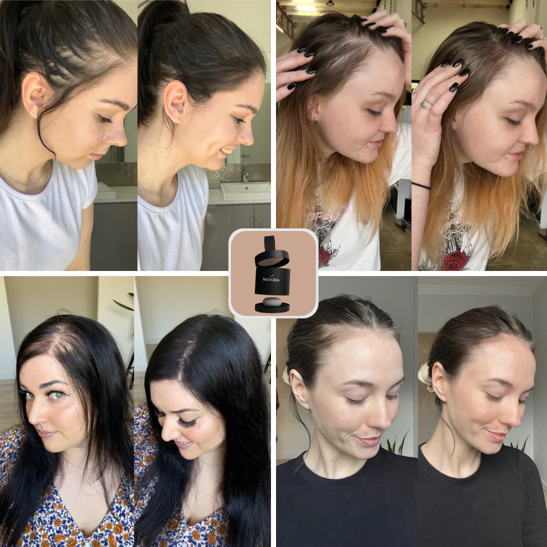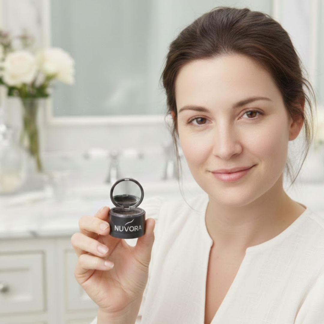 Literally 10 seconds! Just sprinkle Nuvora on your thinning areas, pat it down, and you're good to go. It’s the fastest way to get fuller-looking hair every morning.